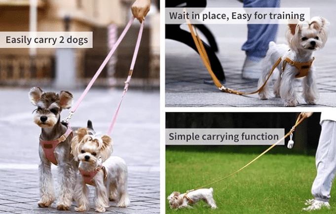 Dog Leash: Our dog harness comes with a multi-functional leash adjustable to lengths of 49 inches and 37 inches. This leash allows you to easily walk two dogs simultaneously and includes features for carrying keys or waste bags. The leash also has a wait-in-place function for quickly and safely securing your dog.